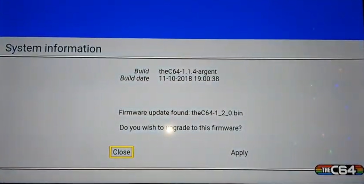 Stažený soubor, theC64-1_2_0.bin si nakopírujte, na Vámi připravenou flešku. Zasuňte do konzole a udělejtě upgrade.( settings-system information- a uvidíte Frimware update found: theC64-1.2.0.bin, dejte Aplly.